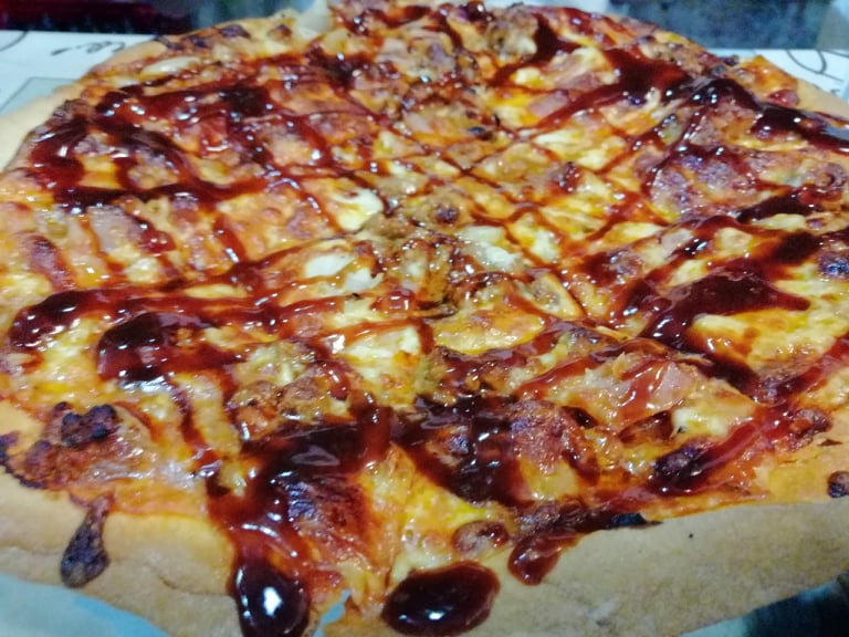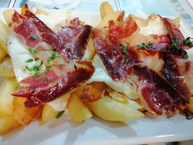 Nuestra Experiencia: Surtido de frituras, pizza de jamón y champiñones, pizza barbacoa y patatas con huevo y jamón